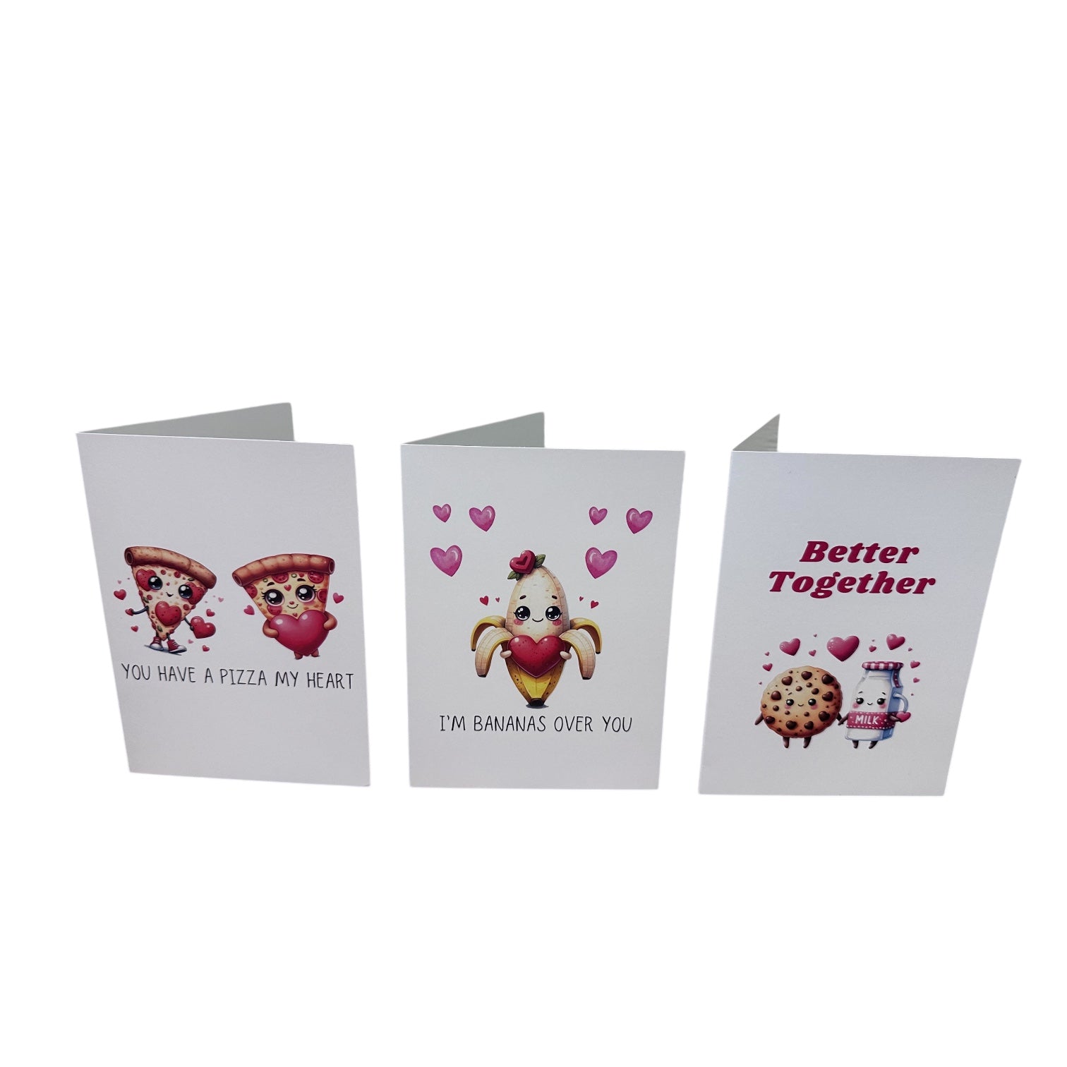 Each of these food inspired Love pun greeting cards are printed on premium matte paper and the card is blank inside. The size of the card is (5 x 7 in) and comes with a self-stick red envelope. The greeting card and envelope will be packaged in a clear cello sleeve.